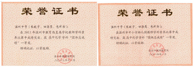 因此,教研组形成了良好的教风学风,具有良好的教科研学术氛围,教研组成员富有团队精神、进取精神和创新意识,夺得历年市命题比赛一等奖,历年全国化学奥赛团体优胜奖,市青年教师技能大赛一等奖。