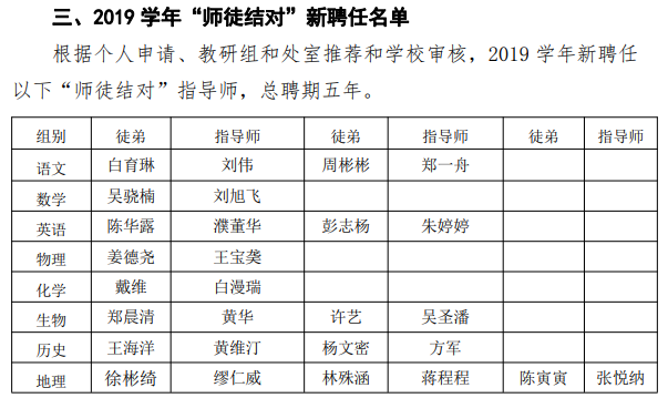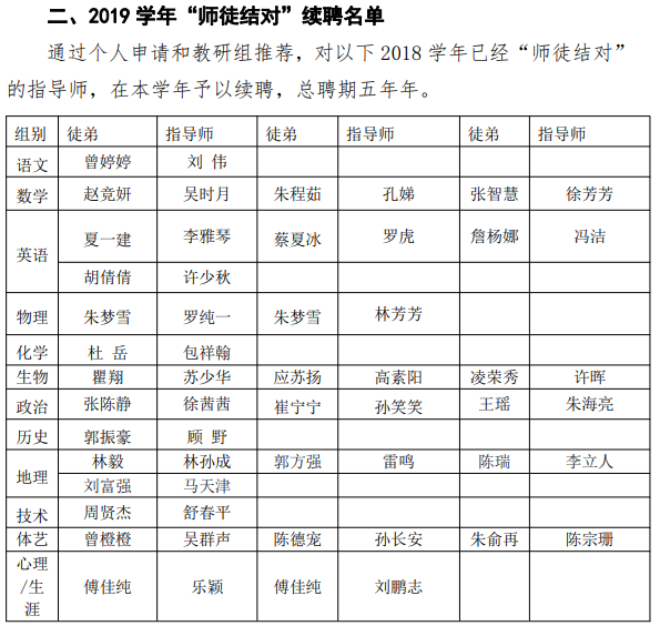 为了进一步落实学校“十三五”教育发展规划,研究新课标、新教材,适应新高考;达成betway官网中文版师资分层培养目标,促进学科组人才梯队培养。经研究,公布 2019 学年betway官网中文版校级名师工作室暨师徒结对名单。