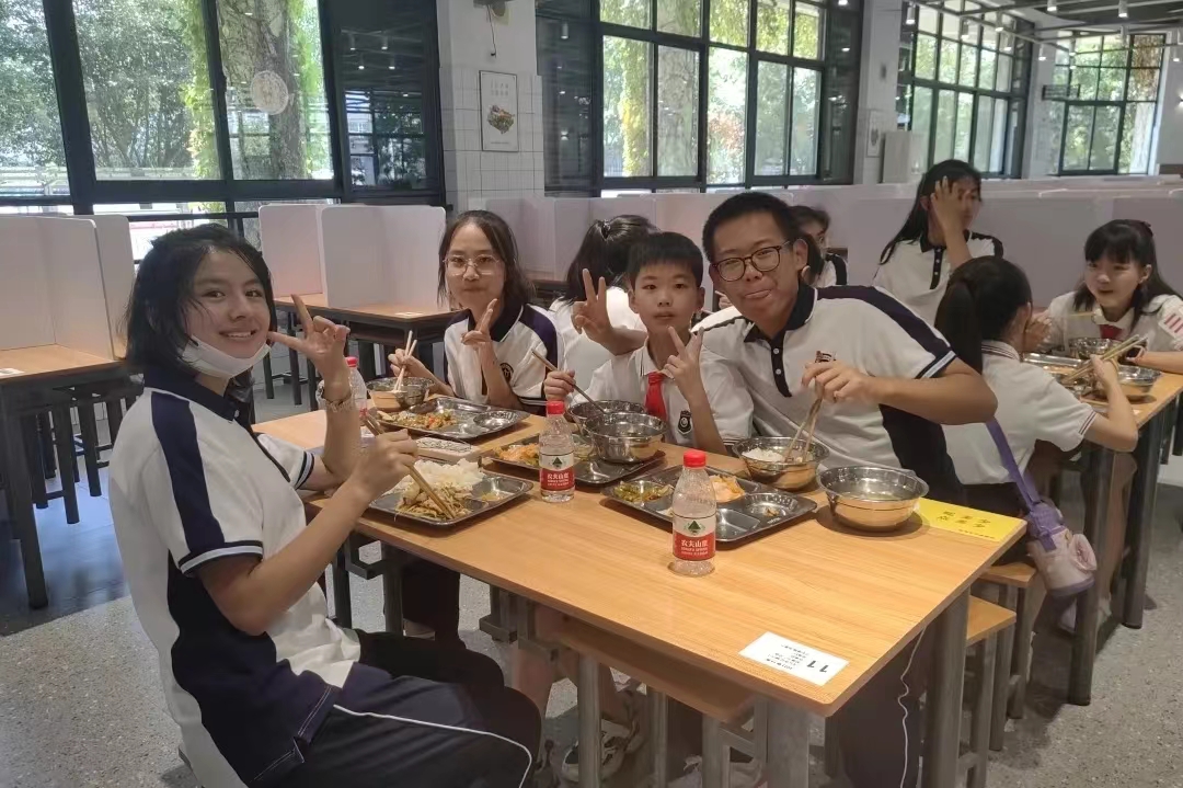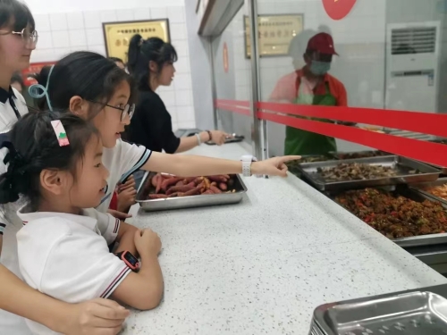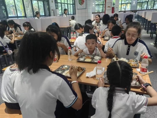 正午时分,新疆部的同学带小朋友们来到食堂,指引并帮助他们打好饭菜。在共享美味午餐的同时,两校学生还滔滔不绝地谈起各自家乡的美食。